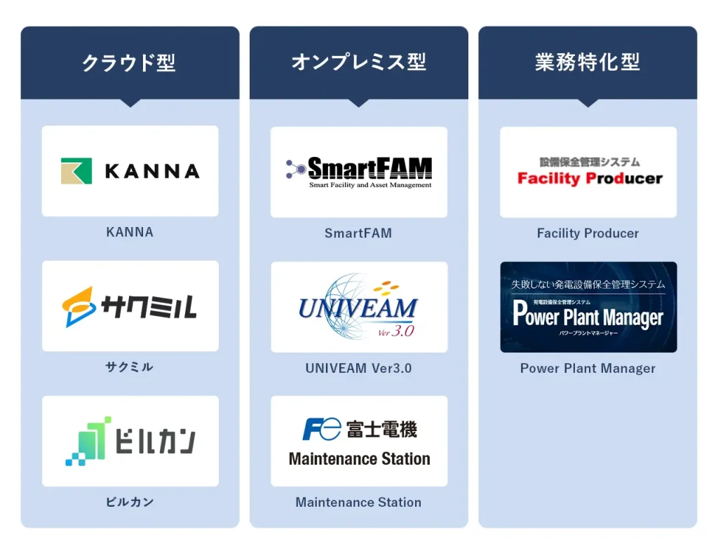 クラウド型・オンプレミス型・業務特化型で特におすすめの設備保全管理システムを下記の表でまとめました。