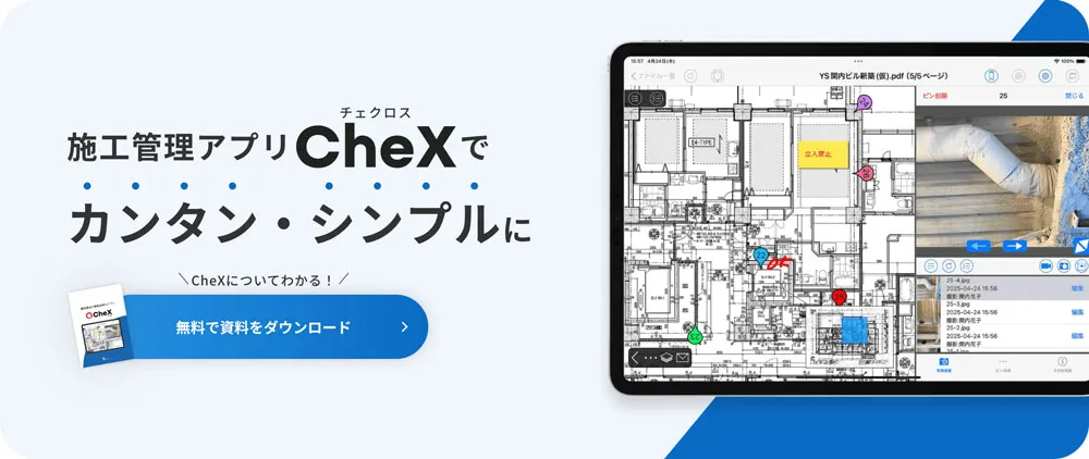 CheX(チェクロス)は、図面・工事写真・メモを現場で“見る・書く・共有する”ことに特化した施工管理アプリ。