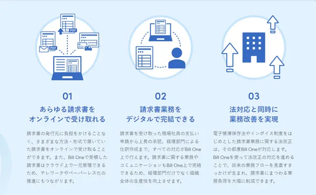 Bill One請求書受領はあらゆる請求書をクラウド上で一元管理でき、オンラインで受け取れるサービスです。