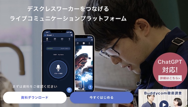 デスクレスワーカーをつなげるライブコミュニケーションプラットフォームである「Buddycom」は、インターネットを利用してスマートフォンやタブレットにアプリをインストールすることで、無線機のように複数人と同時コミュニケーションを可能にするサービスです。