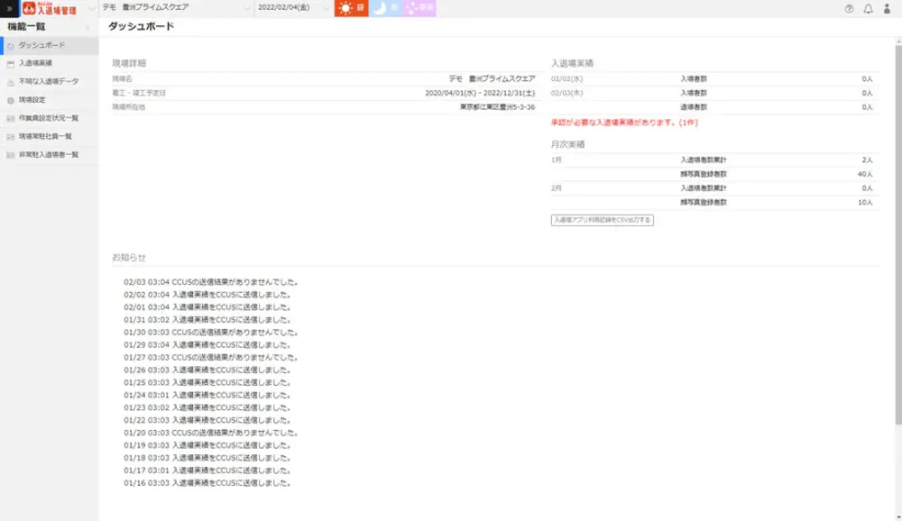 • 入退場管理データの活用:蓄積された入退場データをもとに、現場の労務管理や作業実績の確認などに活用できます。