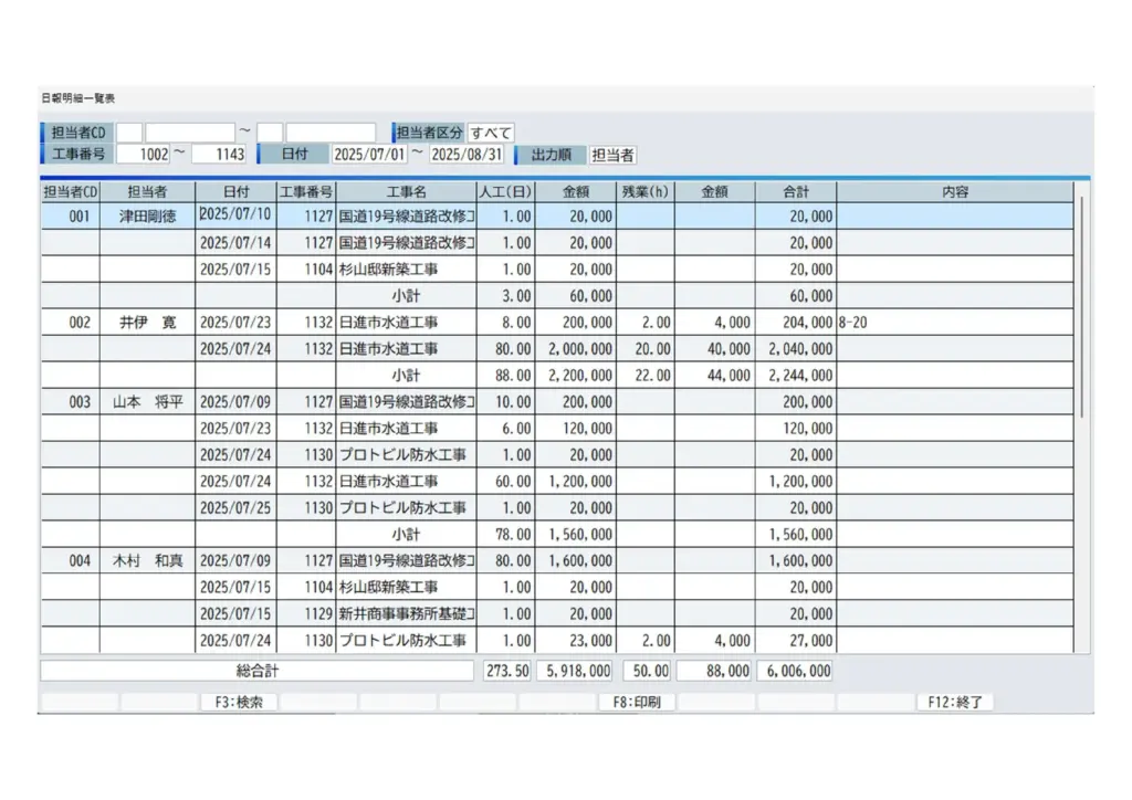 主な機能として、工事別人工集計(出面集計)と人別工事現場集計があります。