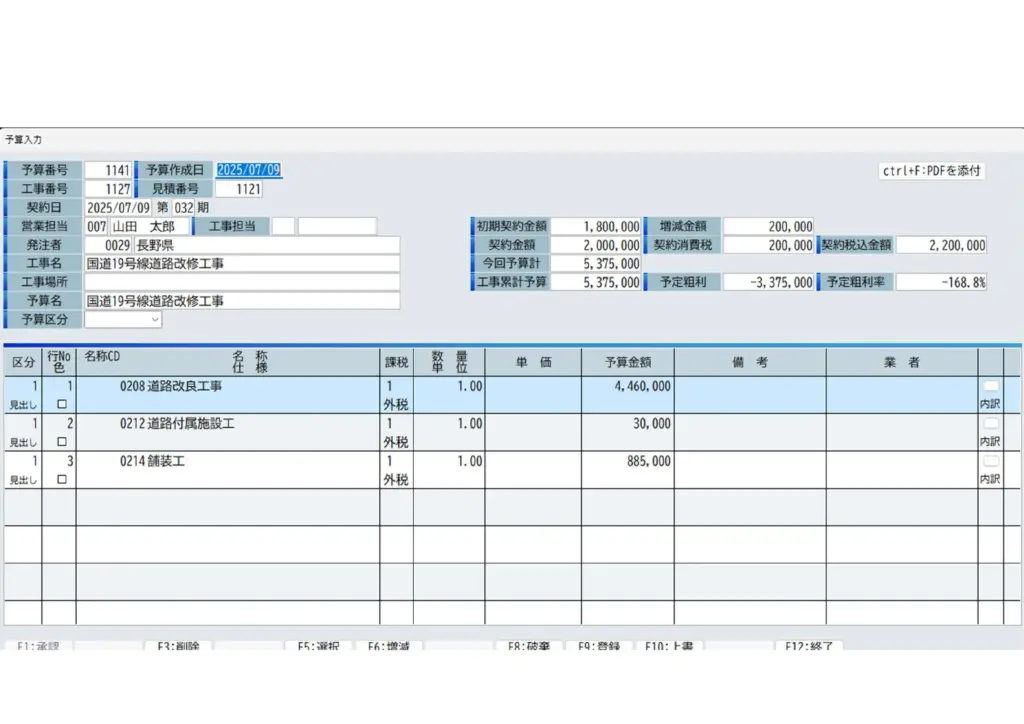 材料費や労務費、外注費など、各項目を細かく設定し、プロジェクト全体の予算を正確に把握できます。