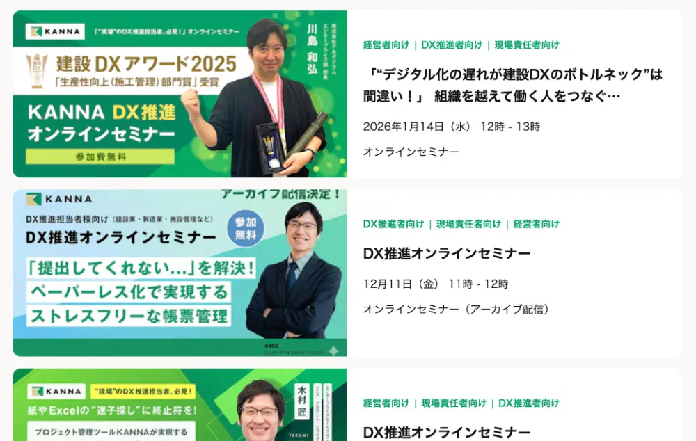 KANNAでは、「施工管理アプリはどのような役割をになっているか」「他社の成功事例を参考にしたい」という企業に向けてオンラインセミナーを行っています。