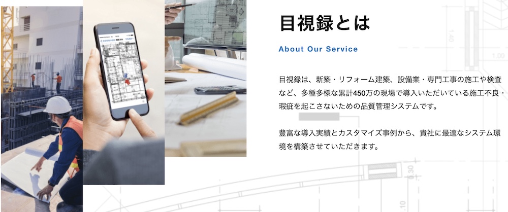 株式会社エー・エス・ディが運営する施工管理アプリの「目視録」は、施工監理や品質管理・品質向上のためのサポートを20年以上行っており、品質管理を支援してきたノウハウをシステム化したものです。