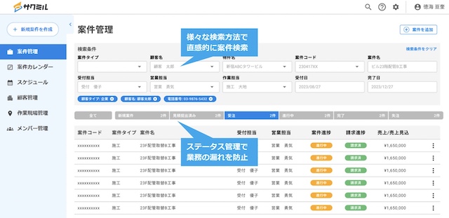 案件名や案件種別、案件ステータス、請求ステータス、顧客名、作業場所名、先方担当者名などをスムーズに確認可能です。