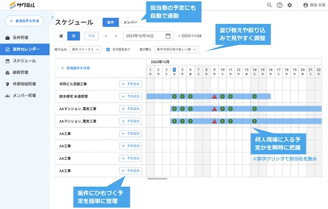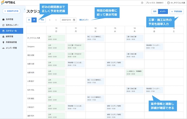日程ごとに対応メンバーの名前が表示される仕組みで、誰がいつどの現場に入るのかが一目瞭然です。